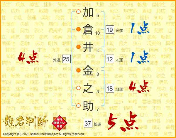 加(5画)倉(10画)井(4画) 金(8画)之(3画)助(7画)