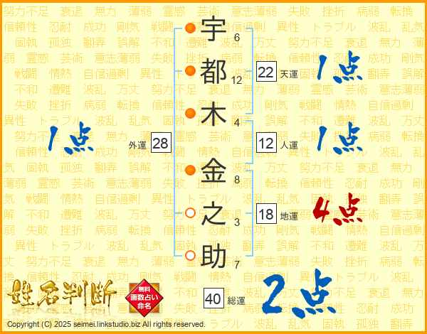 宇(6画)都(12画)木(4画) 金(8画)之(3画)助(7画)