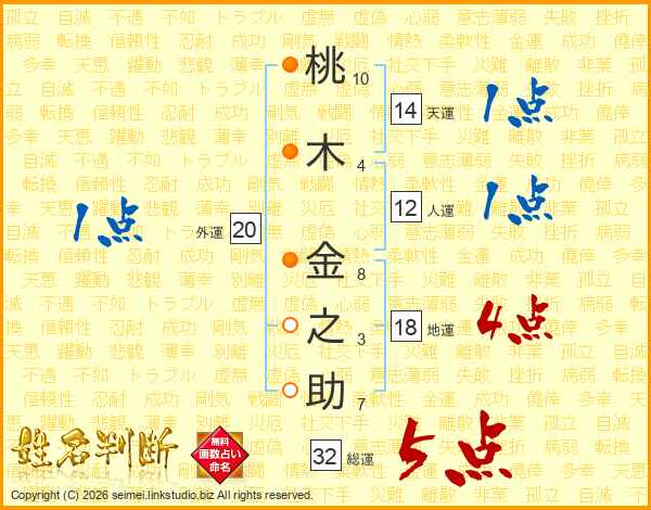 桃(10画)木(4画) 金(8画)之(3画)助(7画)