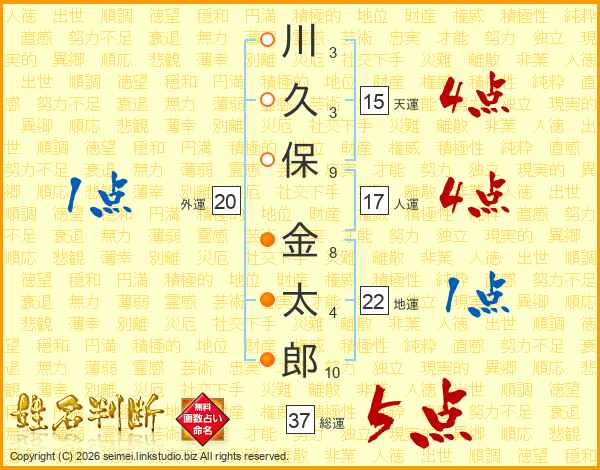 川(3画)久(3画)保(9画) 金(8画)太(4画)郎(10画)