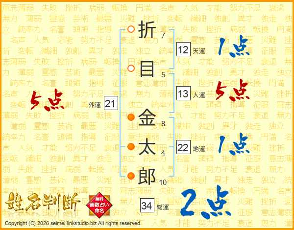 折(7画)目(5画) 金(8画)太(4画)郎(10画)