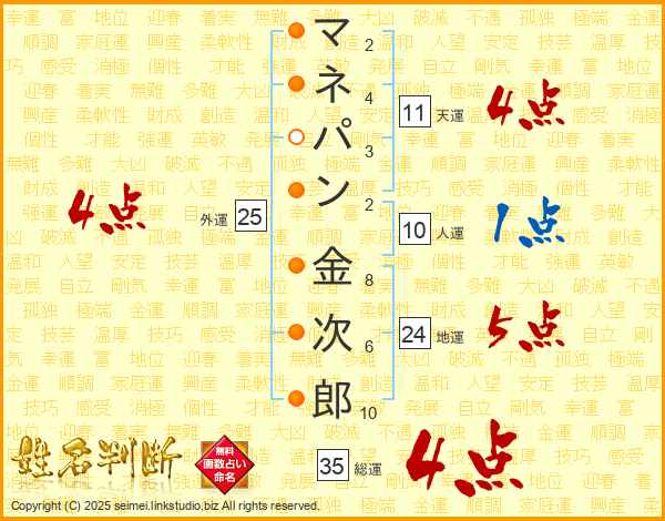 マ(2画)ネ(4画)パ(3画)ン(2画) 金(8画)次(6画)郎(10画)