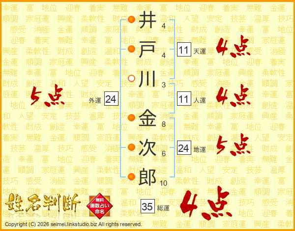 井(4画)戸(4画)川(3画) 金(8画)次(6画)郎(10画)