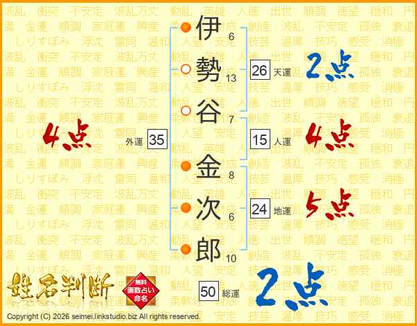 伊(6画)勢(13画)谷(7画) 金(8画)次(6画)郎(10画)