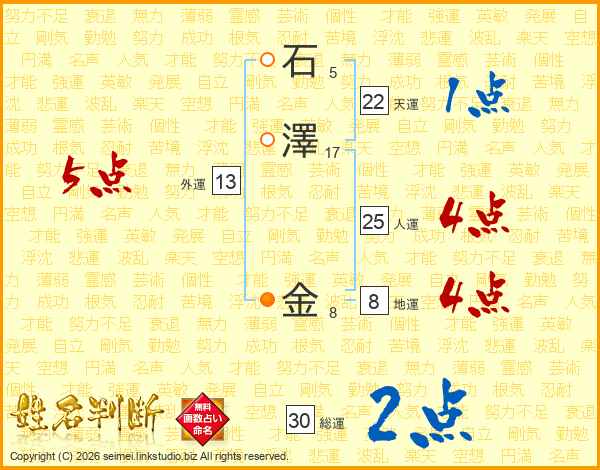 石(5画)澤(17画) 金(8画)
