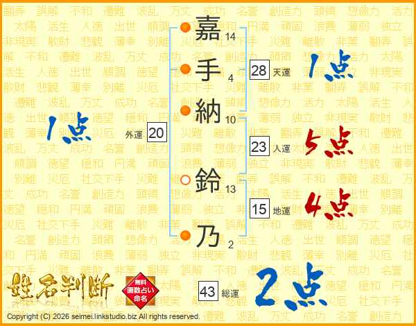 嘉(14画)手(4画)納(10画) 鈴(13画)乃(2画)