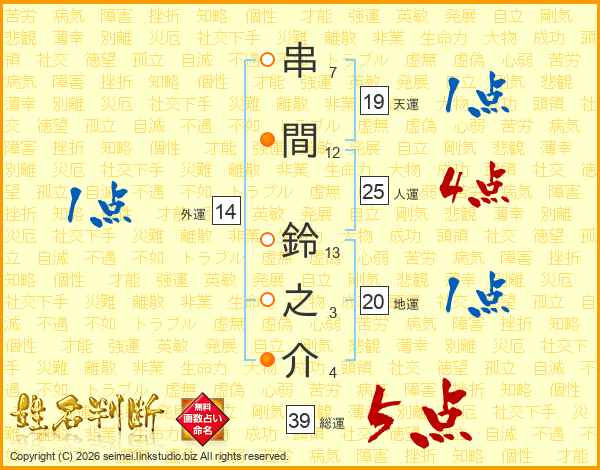あなたの人生を表す1番重要な運勢です。生涯を通じて影響する総合運となり、主に50歳以降の晩年期に影響を及ぼします。苗字と名前の合計画数。