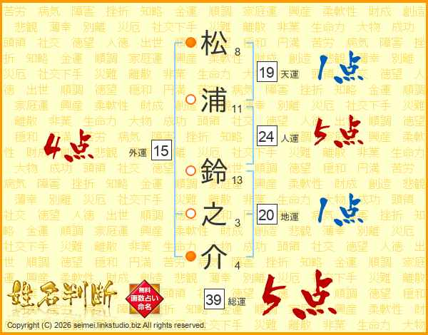 松(8画)浦(11画) 鈴(13画)之(3画)介(4画)