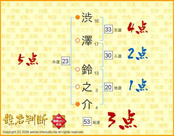 渋(16画)澤(17画) 鈴(13画)之(3画)介(4画)