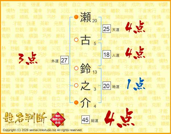 瀬(20画)古(5画) 鈴(13画)之(3画)介(4画)