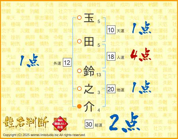 玉(5画)田(5画) 鈴(13画)之(3画)介(4画)