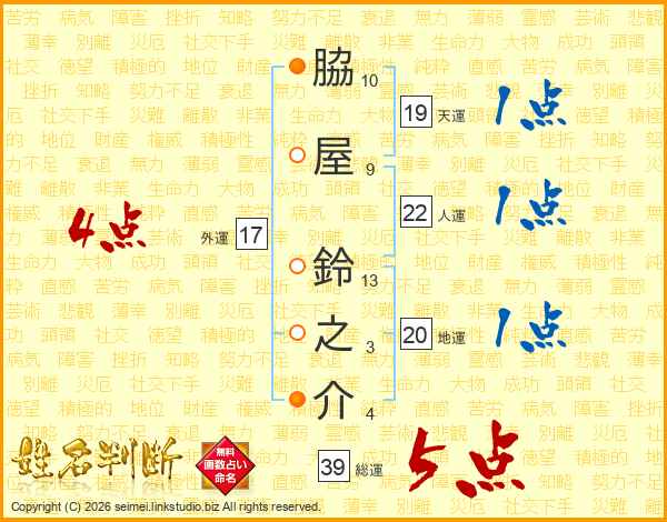 脇(10画)屋(9画) 鈴(13画)之(3画)介(4画)