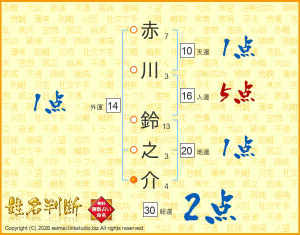 赤(7画)川(3画) 鈴(13画)之(3画)介(4画)