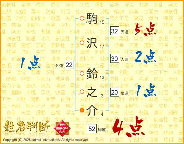 駒沢鈴之介さんの総運は52画の4点!