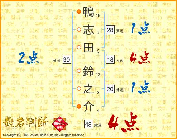 鴨(16画)志(7画)田(5画) 鈴(13画)之(3画)介(4画)