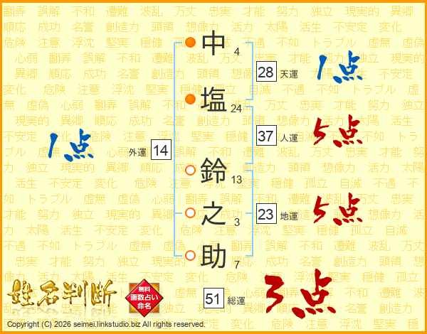 中塩鈴之助さんの人運は37画の5点!