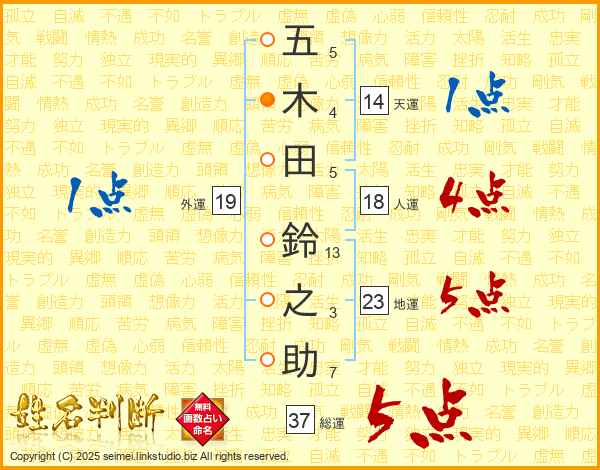 五(5画)木(4画)田(5画) 鈴(13画)之(3画)助(7画)
