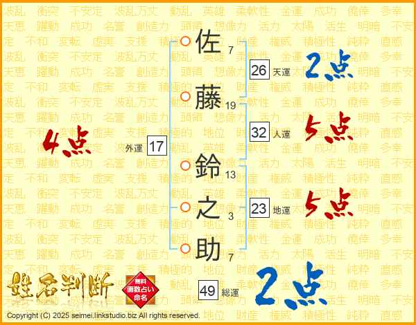 佐(7画)藤(19画) 鈴(13画)之(3画)助(7画)