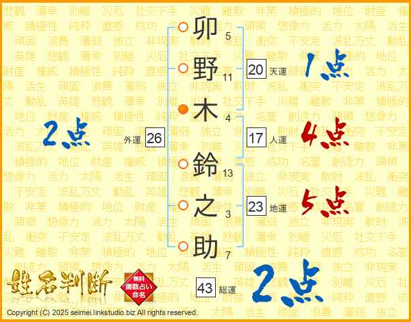 卯(5画)野(11画)木(4画) 鈴(13画)之(3画)助(7画)