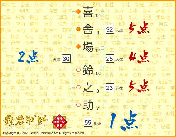 喜(12画)舎(8画)場(12画) 鈴(13画)之(3画)助(7画)