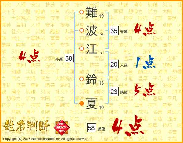 難(19画)波(9画)江(7画) 鈴(13画)夏(10画)
