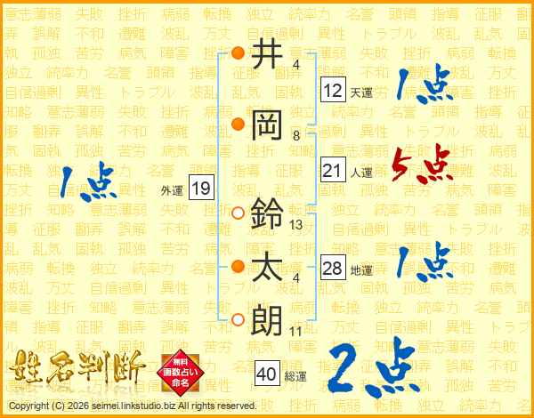 井(4画)岡(8画) 鈴(13画)太(4画)朗(11画)