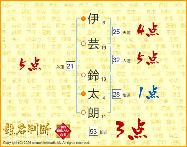 伊(6画)芸(19画) 鈴(13画)太(4画)朗(11画)
