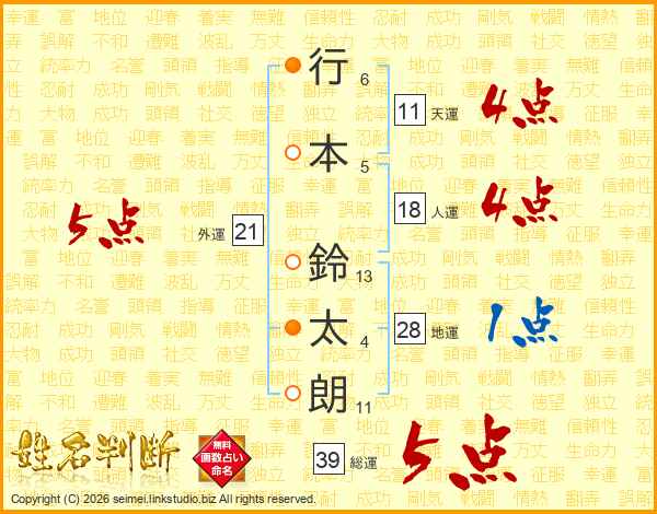 行(6画)本(5画) 鈴(13画)太(4画)朗(11画)
