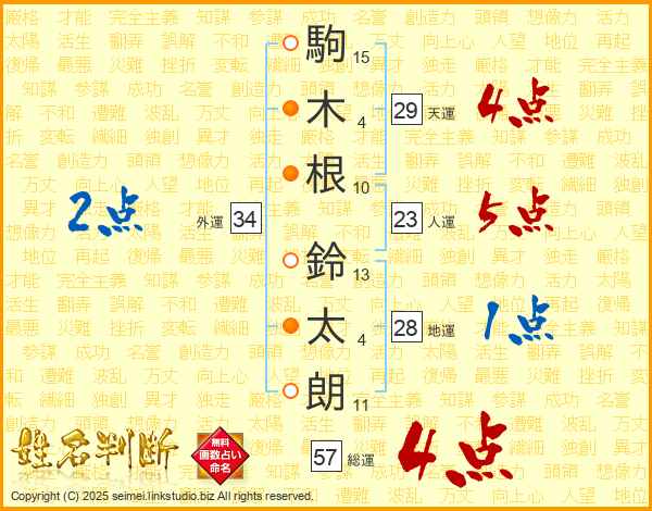 駒(15画)木(4画)根(10画) 鈴(13画)太(4画)朗(11画)
