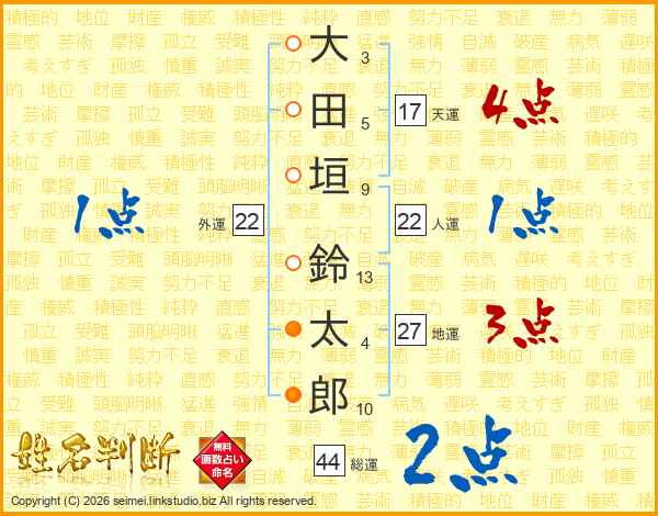 大(3画)田(5画)垣(9画) 鈴(13画)太(4画)郎(10画)