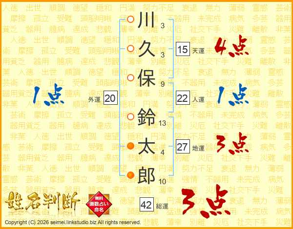 川(3画)久(3画)保(9画) 鈴(13画)太(4画)郎(10画)