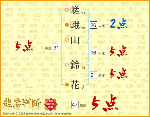 生活面を象徴する運勢です。外部から受ける影響力を表し、結婚運、家庭運や職場、環境への順応性を表します。総運から人運を引いた画数。姓や名が1文字の場合を除く。