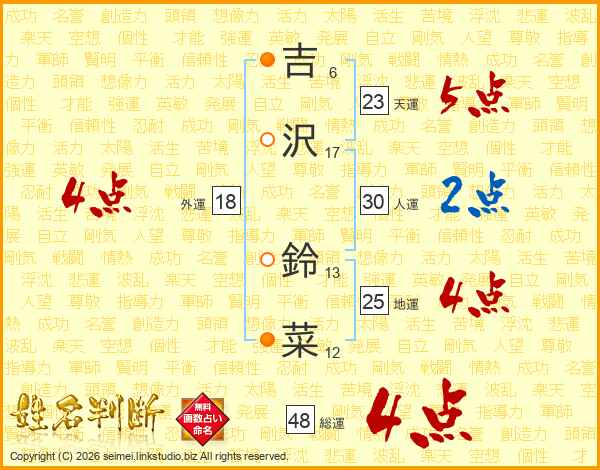 吉(6画)沢(17画) 鈴(13画)菜(12画)