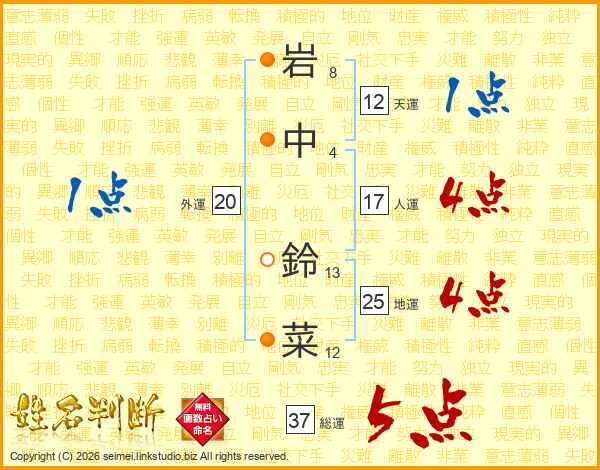 岩中鈴菜さんの総運は37画の5点!