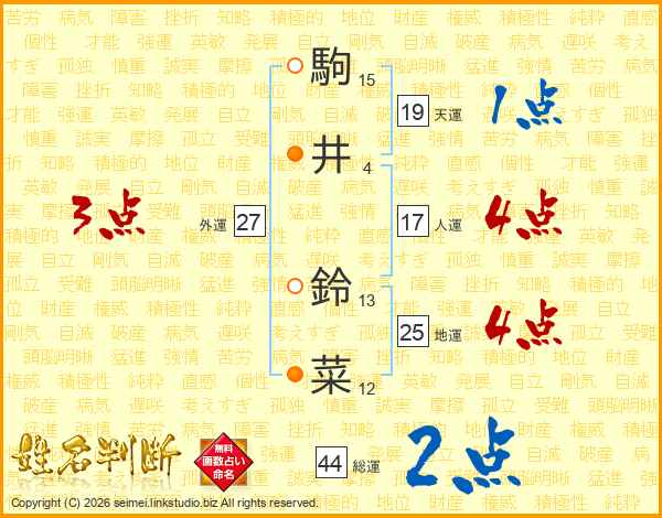 駒(15画)井(4画) 鈴(13画)菜(12画)
