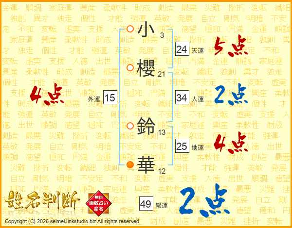 小(3画)櫻(21画) 鈴(13画)華(12画)