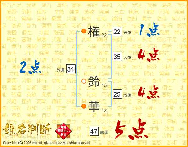 生活面を象徴する運勢です。外部から受ける影響力を表し、結婚運、家庭運や職場、環境への順応性を表します。総運から人運を引いた画数。姓や名が1文字の場合を除く。