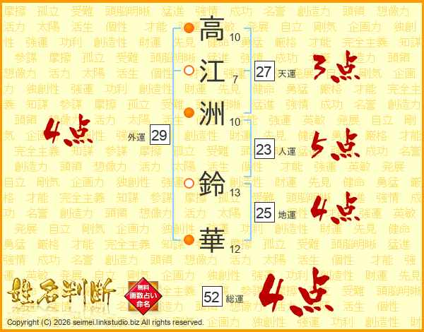 高(10画)江(7画)洲(10画) 鈴(13画)華(12画)