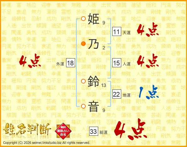 姫(9画)乃(2画) 鈴(13画)音(9画)
