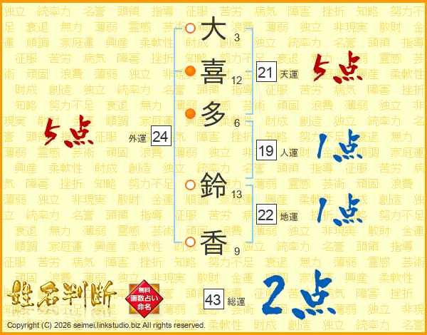 大(3画)喜(12画)多(6画) 鈴(13画)香(9画)