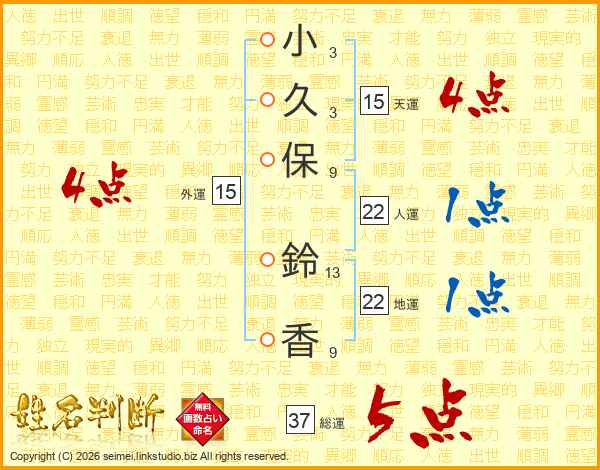 小(3画)久(3画)保(9画) 鈴(13画)香(9画)