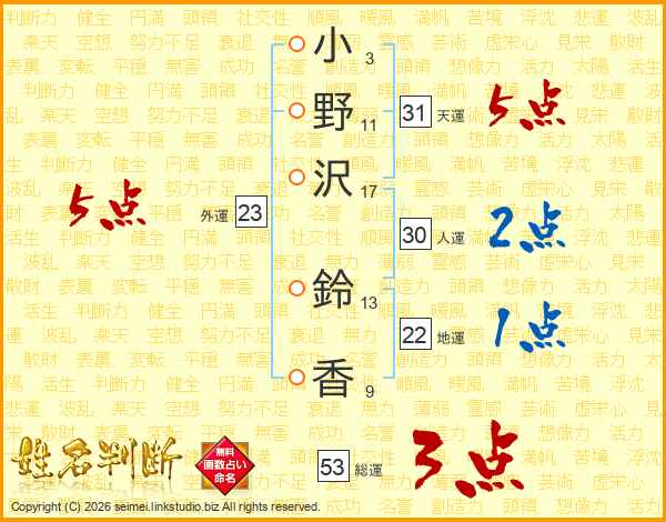 小(3画)野(11画)沢(17画) 鈴(13画)香(9画)