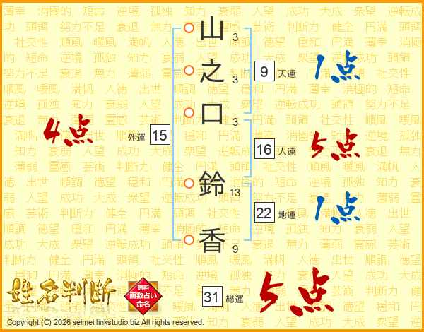 山(3画)之(3画)口(3画) 鈴(13画)香(9画)