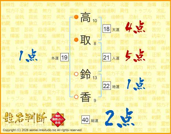 生活面を象徴する運勢です。外部から受ける影響力を表し、結婚運、家庭運や職場、環境への順応性を表します。総運から人運を引いた画数。姓や名が1文字の場合を除く。