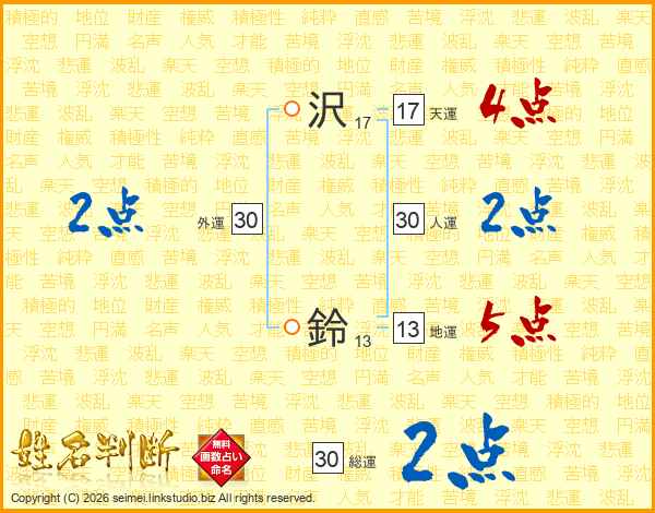 生活面を象徴する運勢です。外部から受ける影響力を表し、結婚運、家庭運や職場、環境への順応性を表します。総運から人運を引いた画数。姓や名が1文字の場合を除く。
