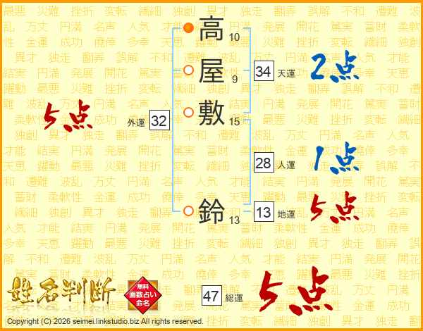 高(10画)屋(9画)敷(15画) 鈴(13画)