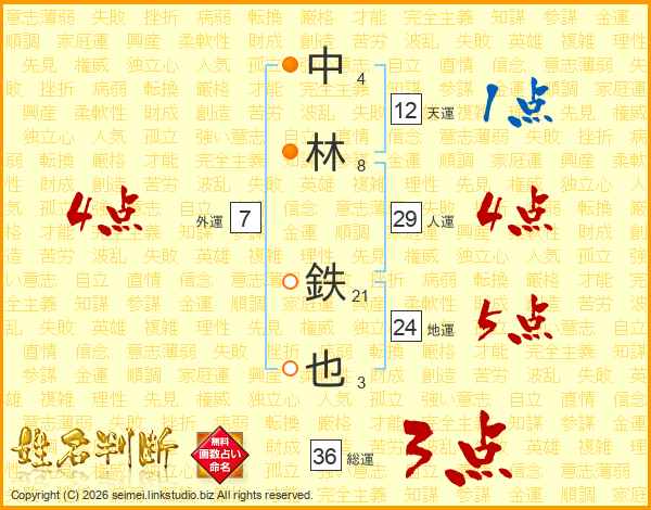中(4画)林(8画) 鉄(21画)也(3画)