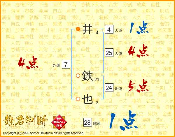 生活面を象徴する運勢です。外部から受ける影響力を表し、結婚運、家庭運や職場、環境への順応性を表します。総運から人運を引いた画数。姓や名が1文字の場合を除く。