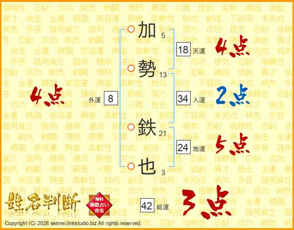 加(5画)勢(13画) 鉄(21画)也(3画)