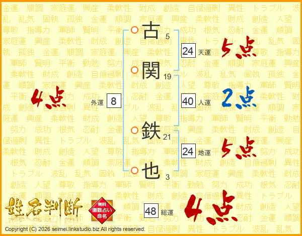 家系が持つ宿命的な運勢を表します。祖先から受け継いだ苗字ですので自分の力が及びません。家柄を象徴します。苗字の合計画数。